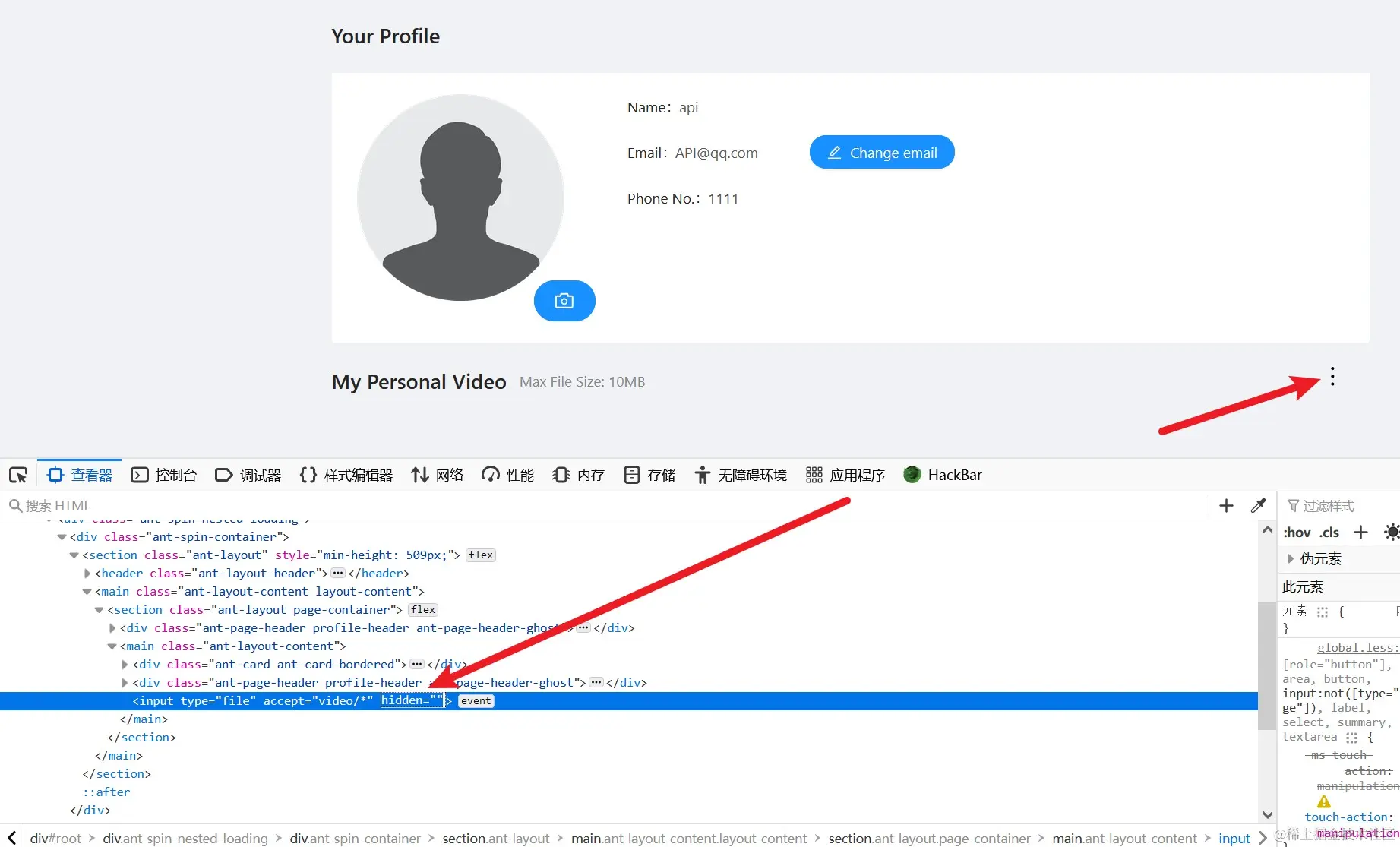 懒得按这个按钮才弹出的上传视频选项,于是我选择修改前端删掉hidden部分就可以: