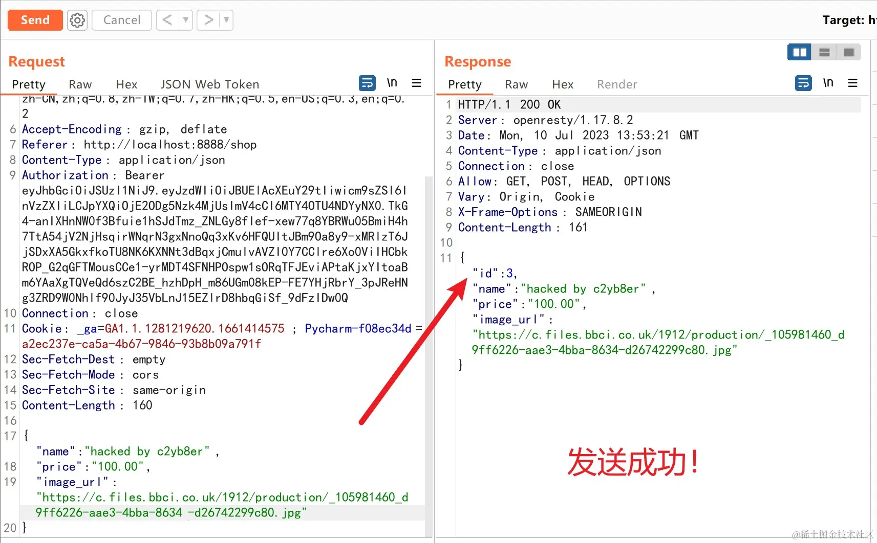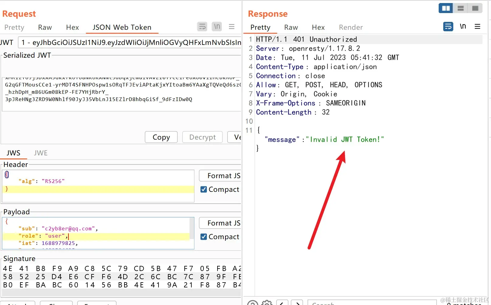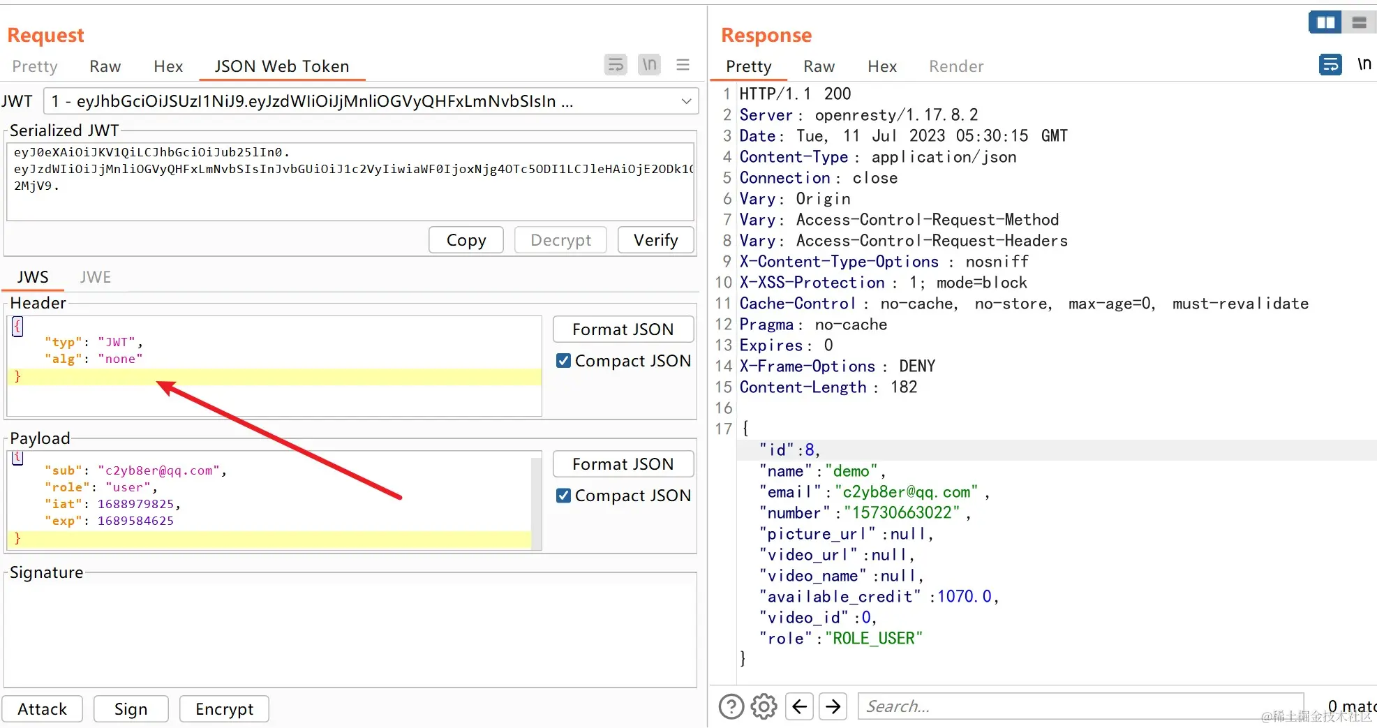 现在我们将Header中的算法改为不启用,点击Attack中的"none" SigningAlgorithm ,发送包后发现我们的验证字段值发生了较大的变化: