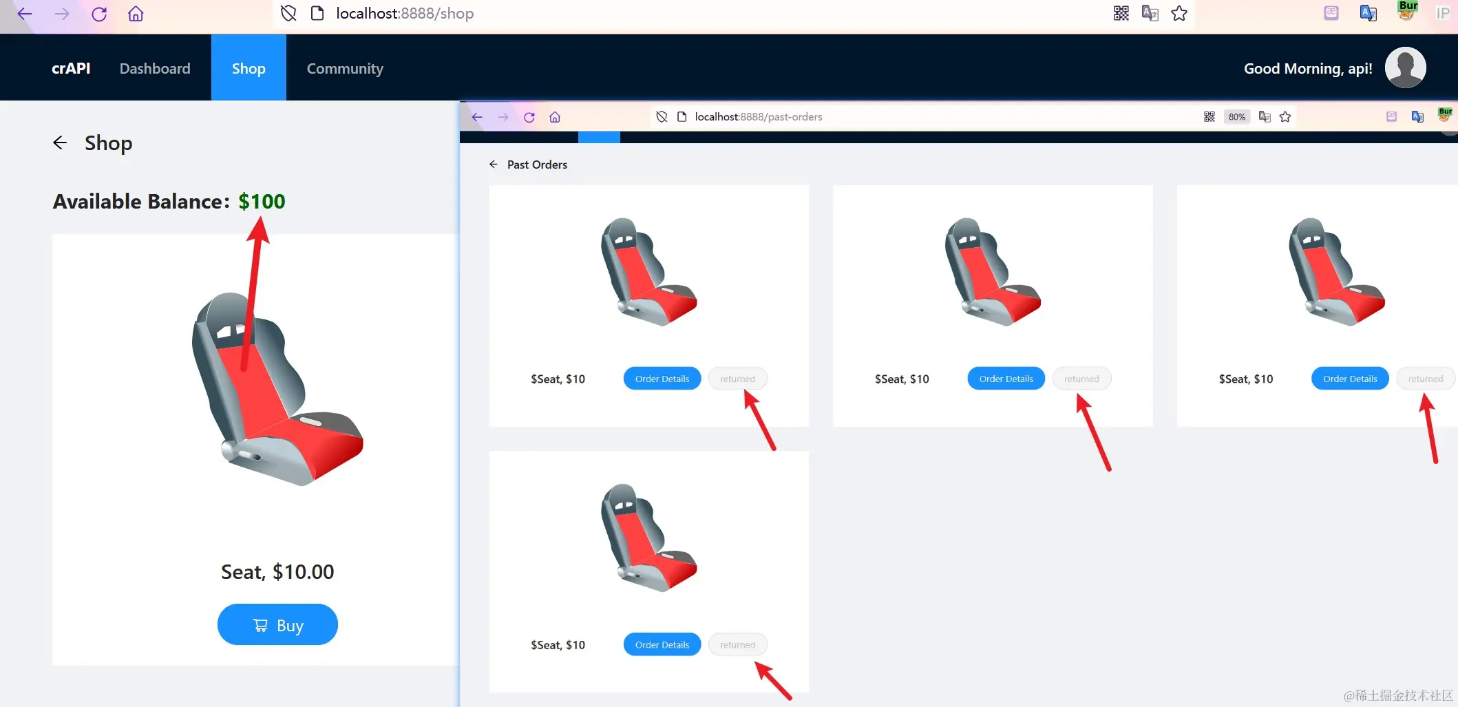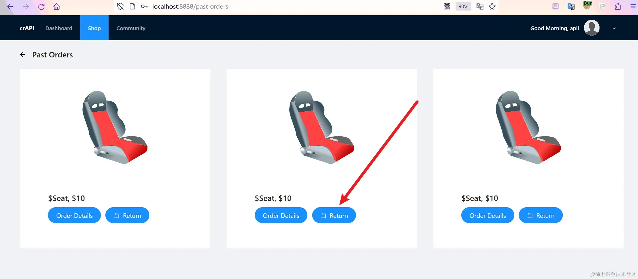 我们可以敏锐地观察到返回的Json数据中有一个status数据,明显表示着已经订购的信息。回到购买界面,我们看到还有Return按钮,我们点击后抓包看看: