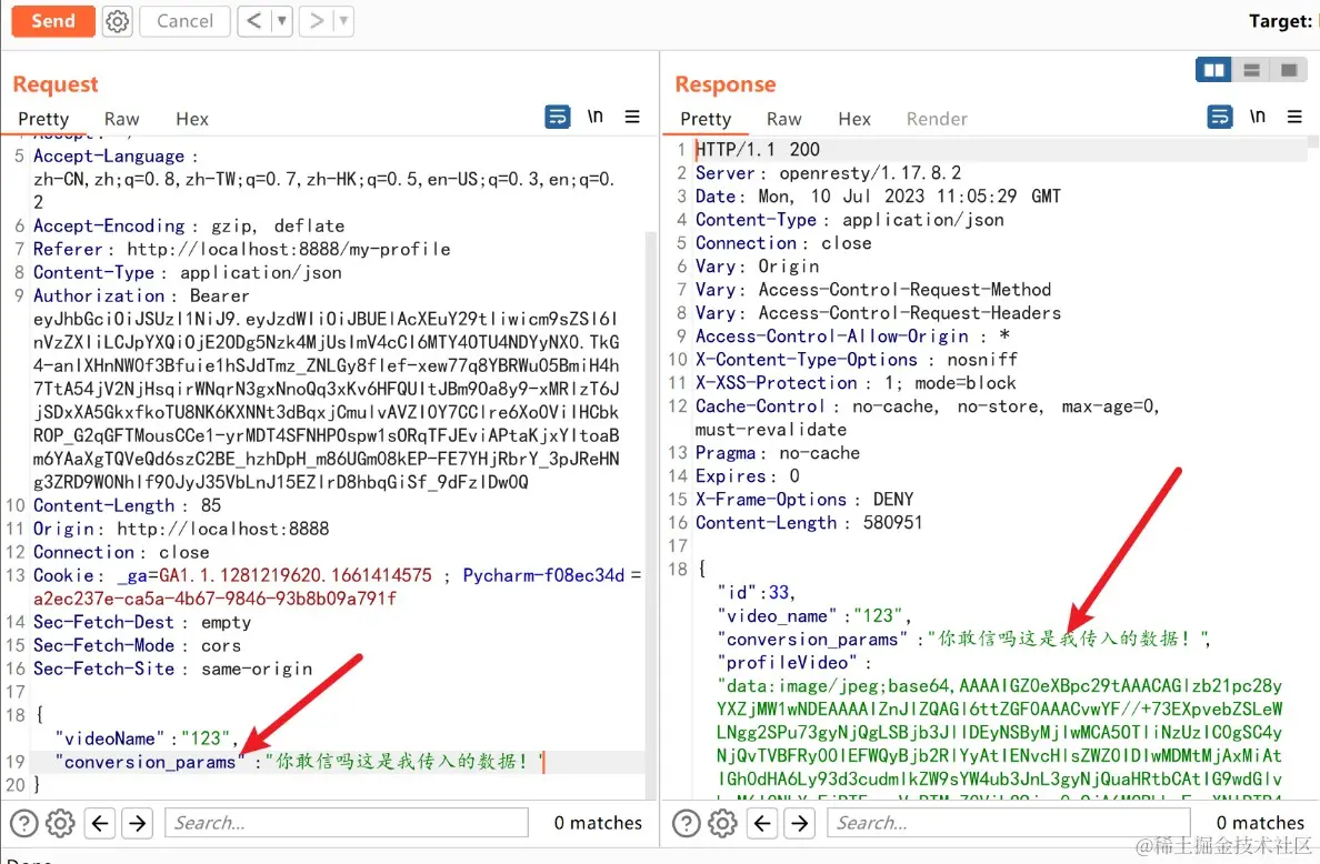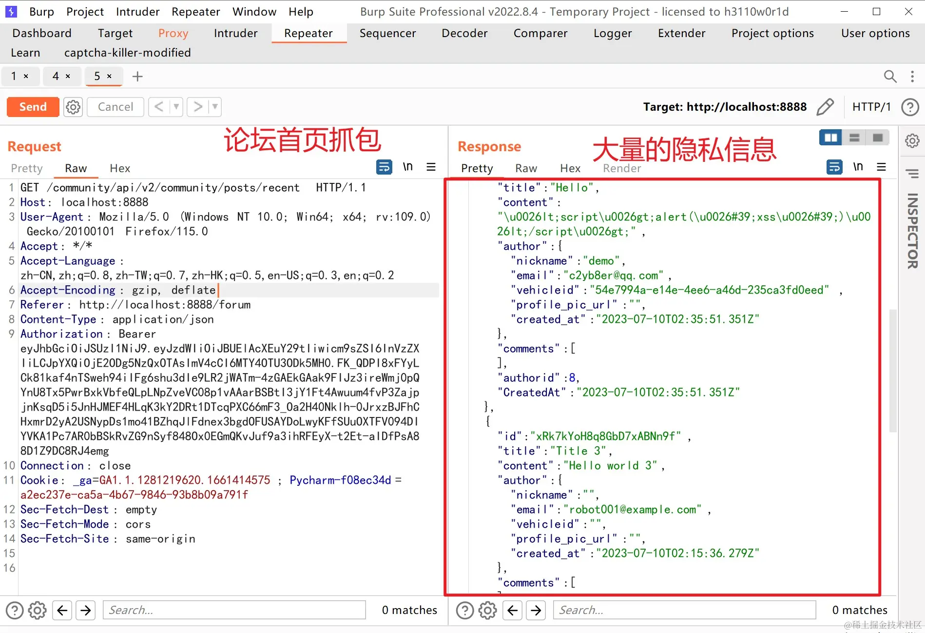 于是试着抓一下包,看能返回什么,可以看到已经返回了该用户的隐私信息: