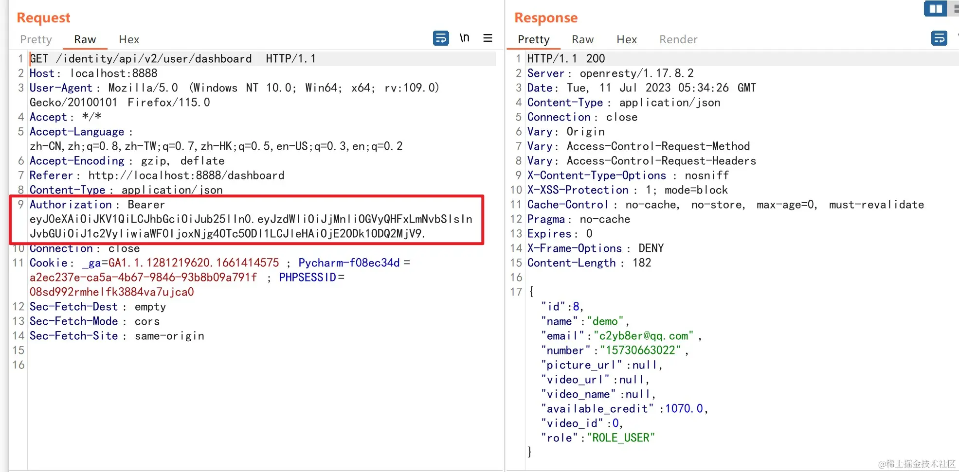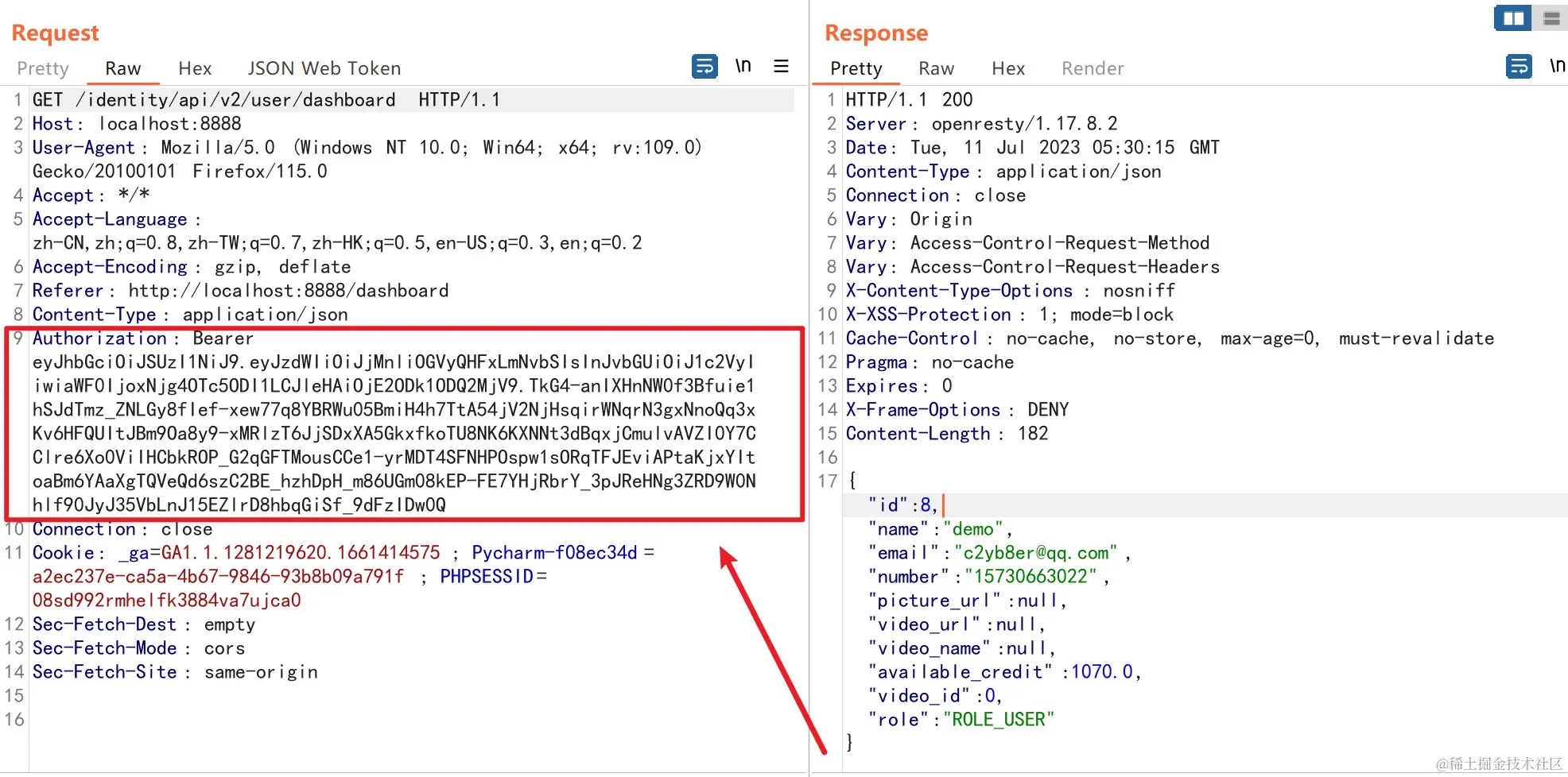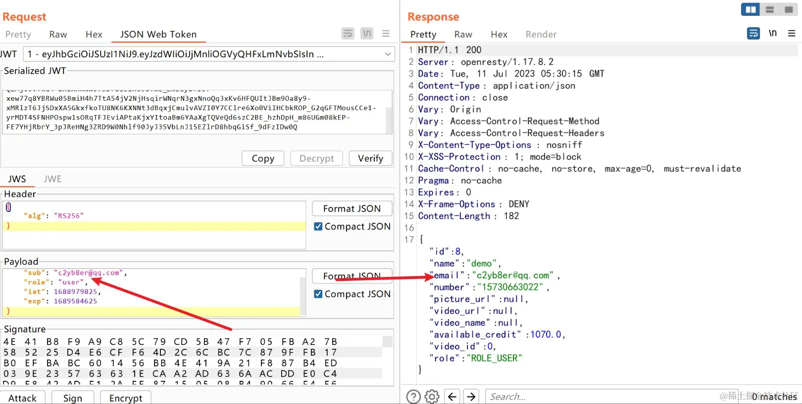 首先我们修改Payload中的sub为其他的账户试试:成功越权访问到其他用户的信息: