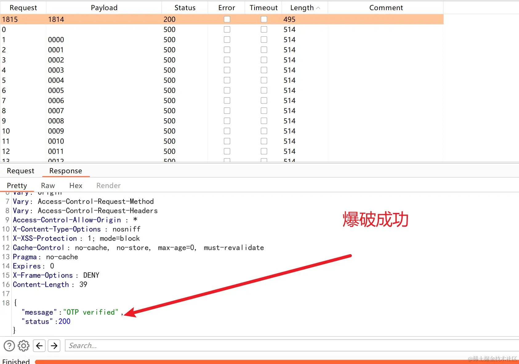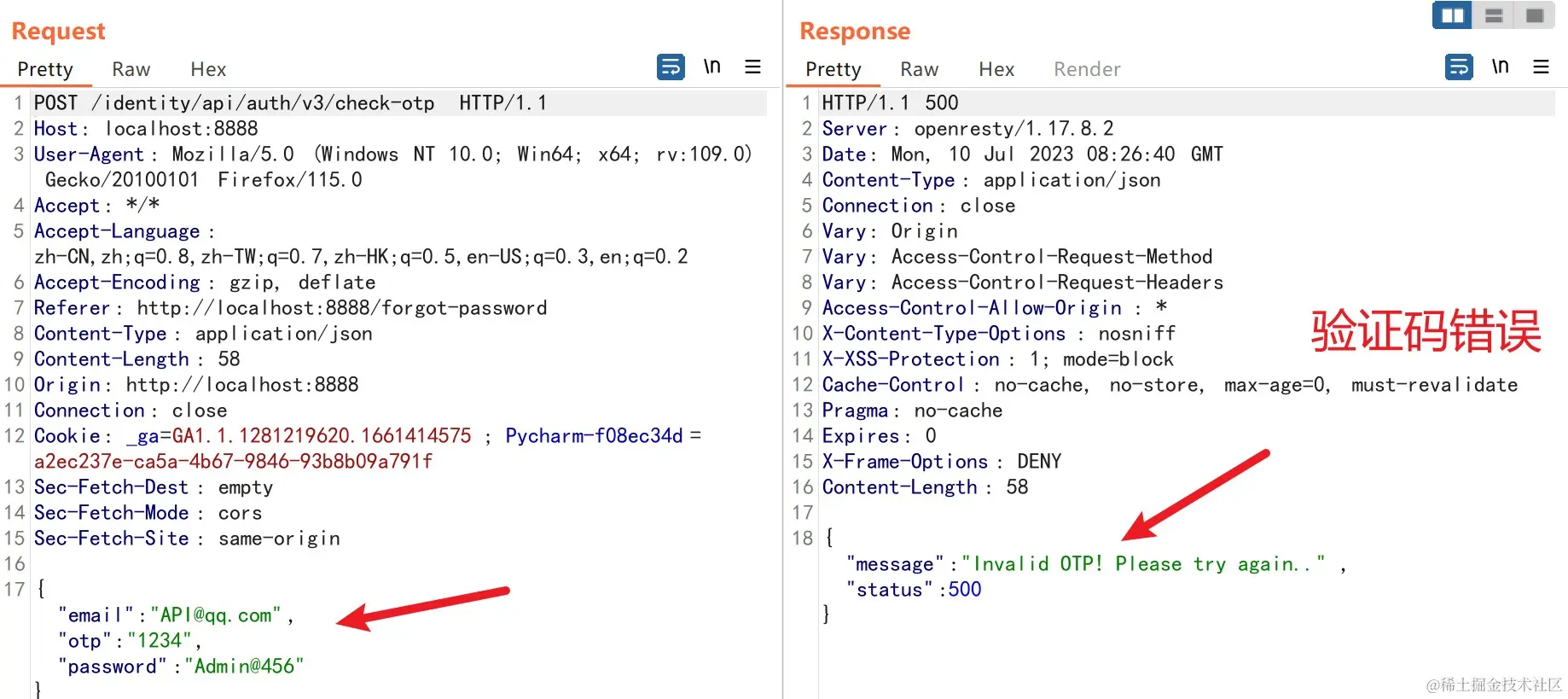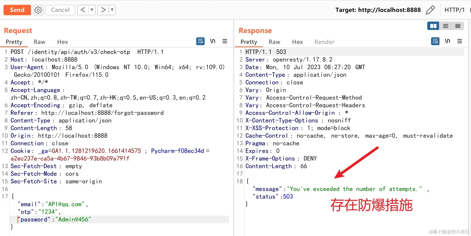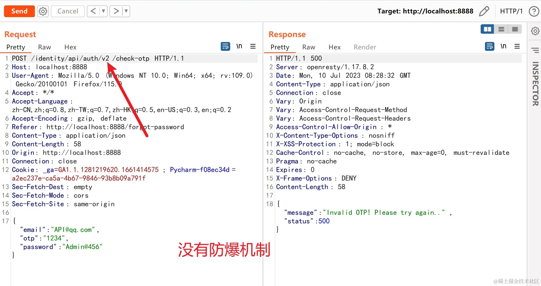 退出登录,点击忘记密码,输入<API@qq.com,点击Sent OTP,在后台查看验证码只有四位,于是准备爆破
