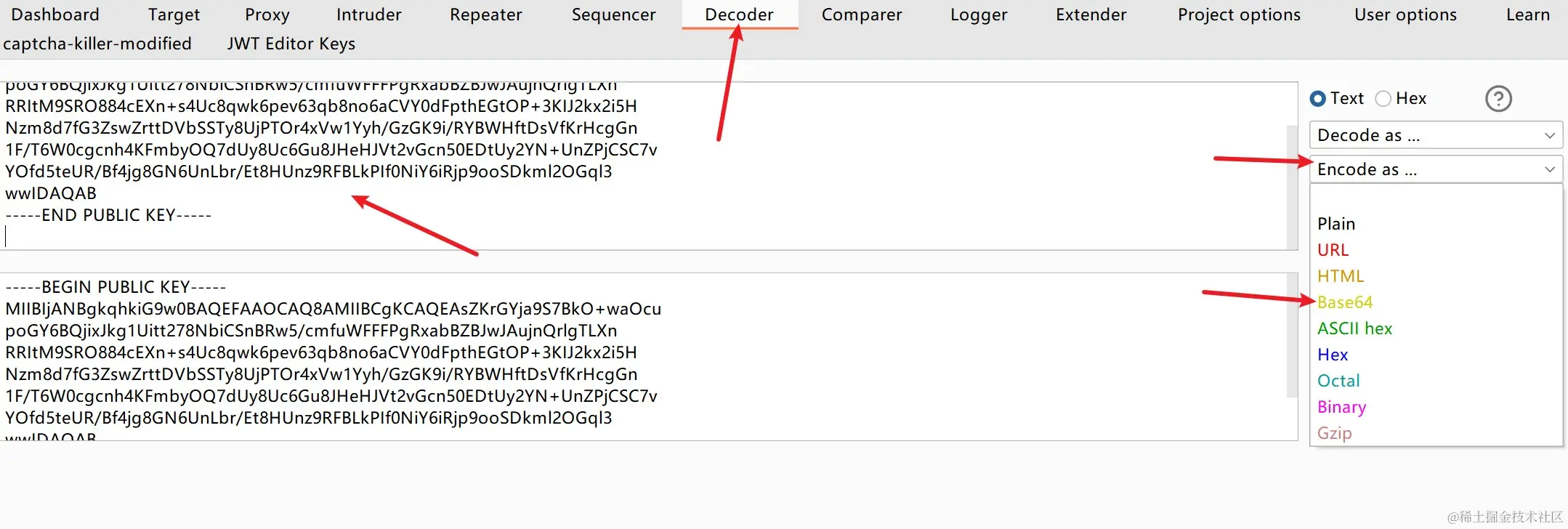 去Decoder选项卡对这个 PEM 密钥进行 Base64 编码,然后复制生成的字符串