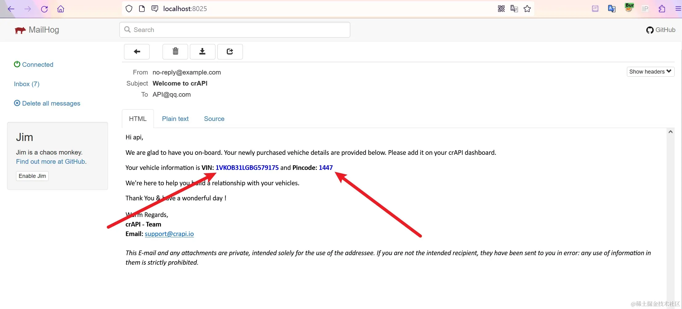 - 登陆后访问对应IP的8025端口,接收邮件获取车辆信息。