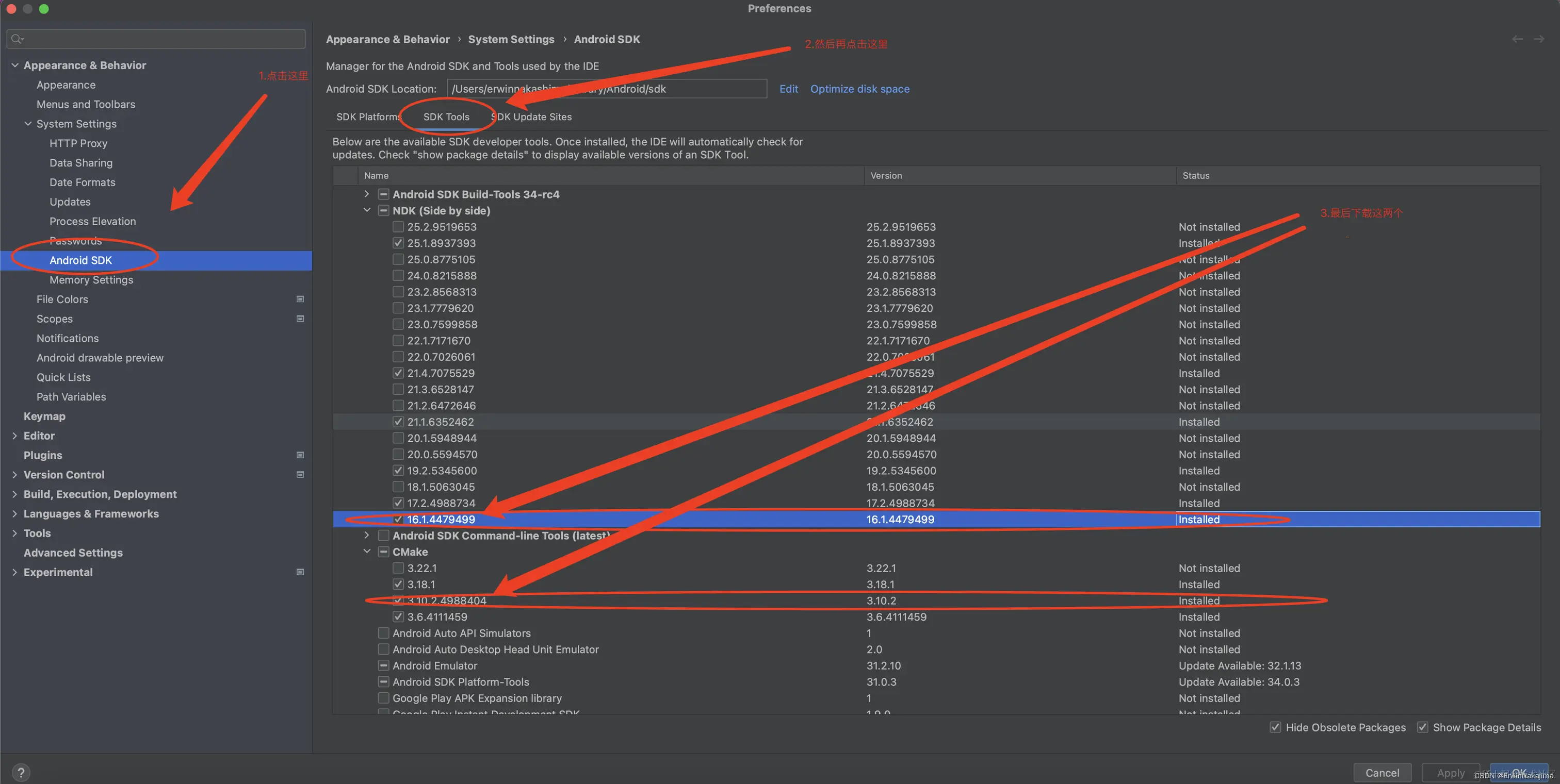 (2)步骤二:下载下图一中第3步红圈中的一个NDK和一个CMake,下载成功后如下图一所示(建议下载前先配置Android Studio 国内镜像代理,详见:Android Studio 国内镜像代理设置(如果设置之后还是远程仓库下载失败,请仔细阅读其内容就可以解决了)_android studio 镜像_ErwinNakajima的博客-CSDN博客)。