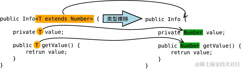 - 如果存在上下界限定则根据子类替换原则取类型参数的最左边限定类型(即父类)