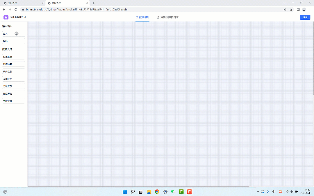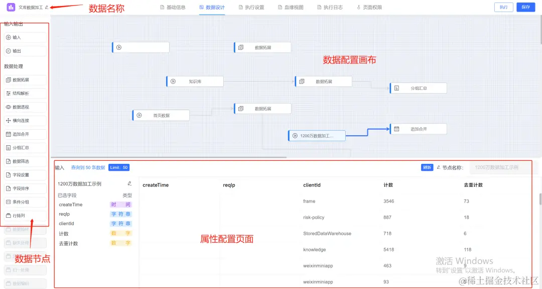 数据设计,左上角可以设置数据集名称,左侧是系统提供的多种数据处理节点,主界面为数据配置画布,左侧的数据处理节点可以拖拽至画布,点击节点,下侧弹出对应的节点配置界面。