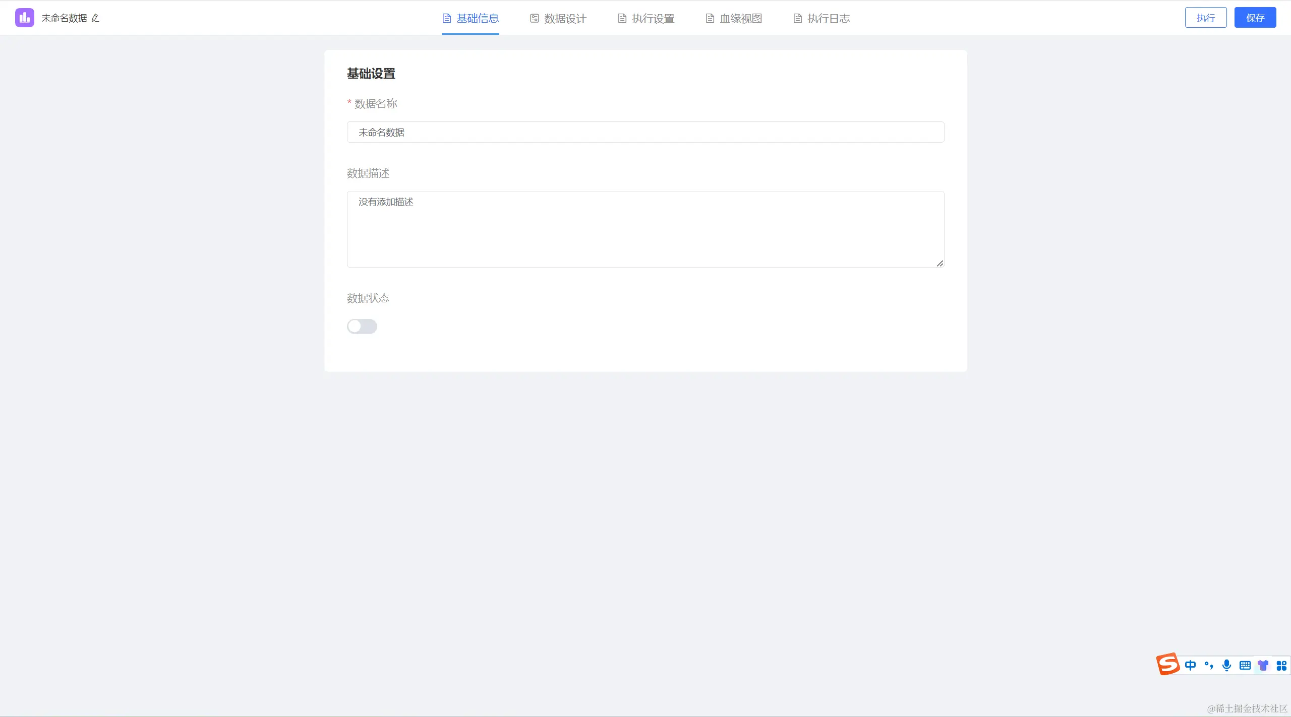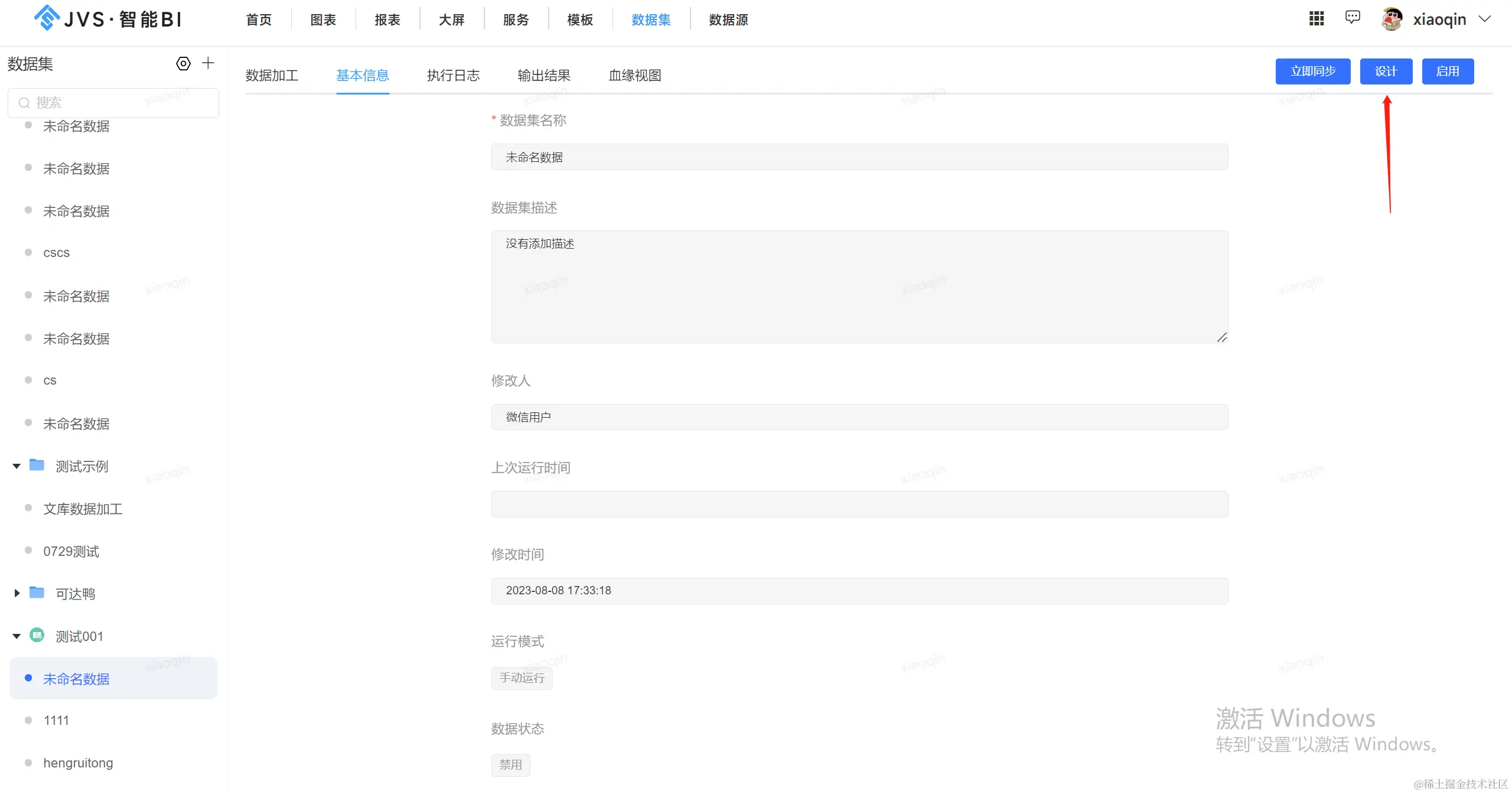 进入到数据集的设计界面,其中包括基本信息配置、界面化的数据设计、周期性执行设置、血缘视图、执行日志等