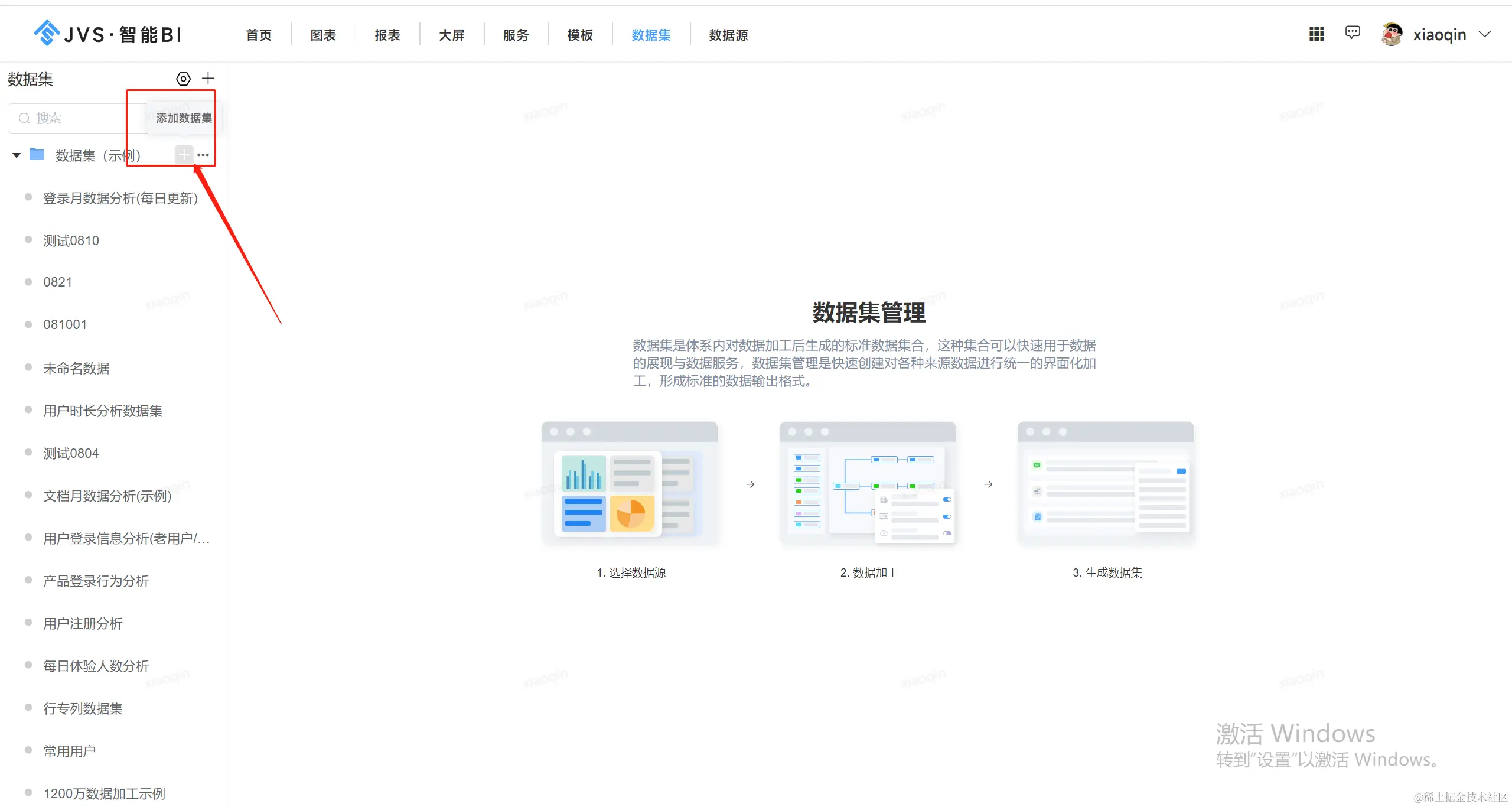 选中对应要添加数据集的目录,点击“+”新增数据集
