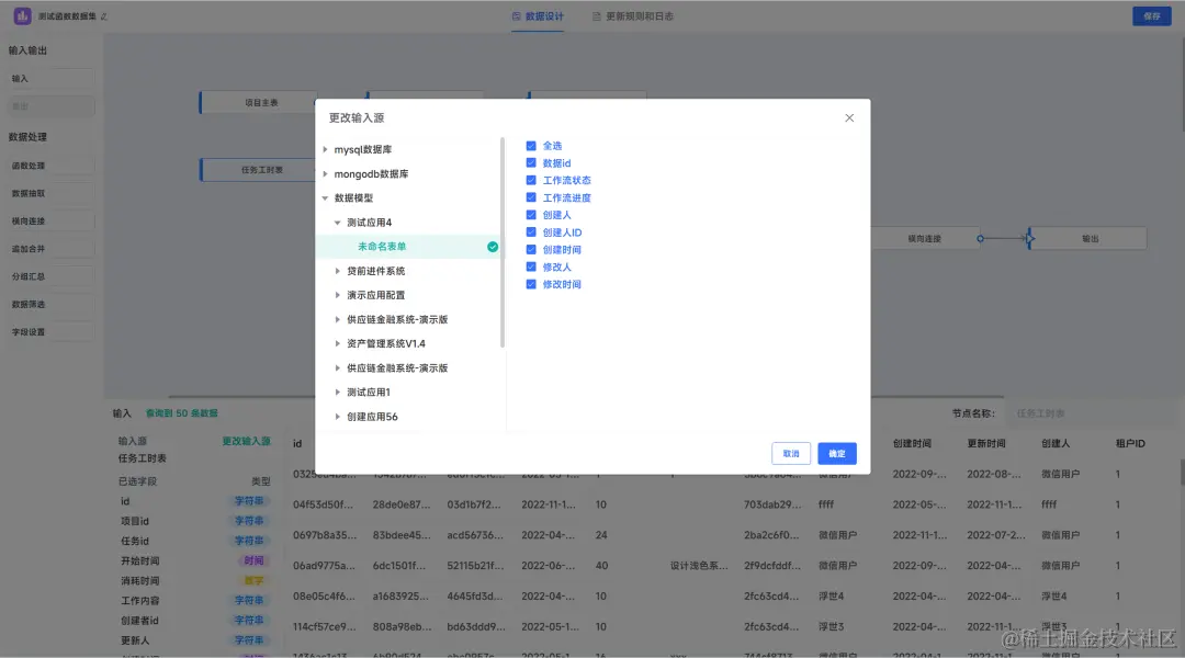 输入节点是数据集设计的数据引入的开始节点,用来选择要处理的数据源。在选择数据源时,将输入节点拖入数据集设计画布,系统将自动弹出数据源的选择弹框,选择对应的数据源后,可以自由勾选所需的字段。