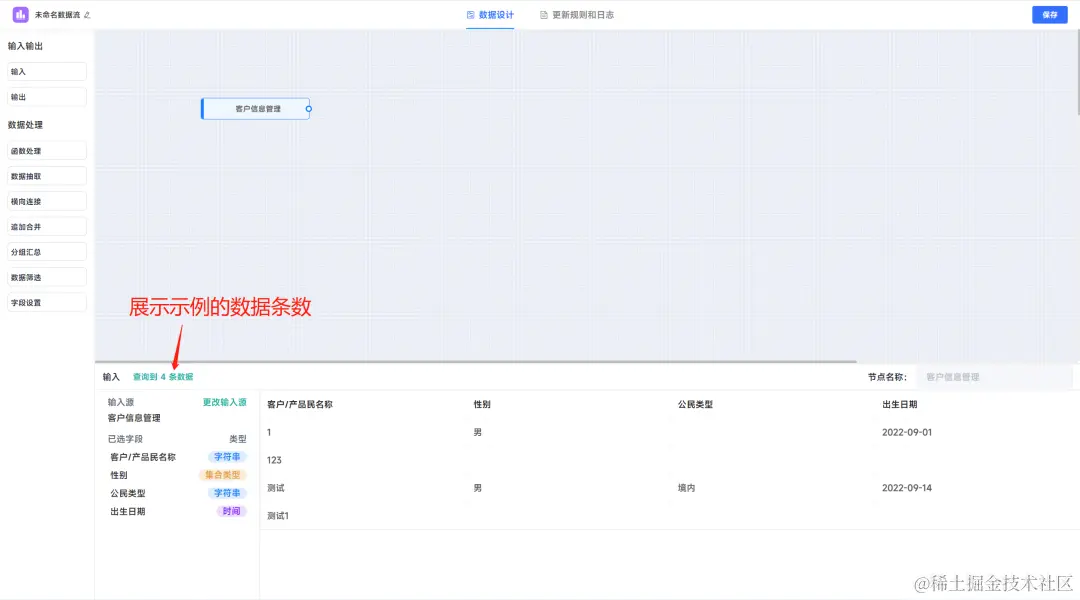 点击选择的数据输入节点,系统下侧展示数据节点的配置界面,左上角展示的数据查询的量(最大只能查询到50条,数据量过大不宜展示),并将选择的数据字段名称与类型,并把对应数据预览出来,如下图所示