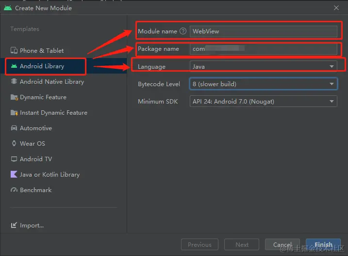 创建用于封装AAR包的模块。选中工程名,右键New-->Module。例如本项目创建名为WebView的模块。