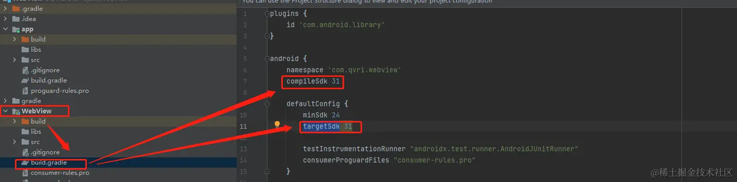 在WebView模块中,找到并打开build.gradle文件,将compileSdk和targetSdk修改为31或以上。