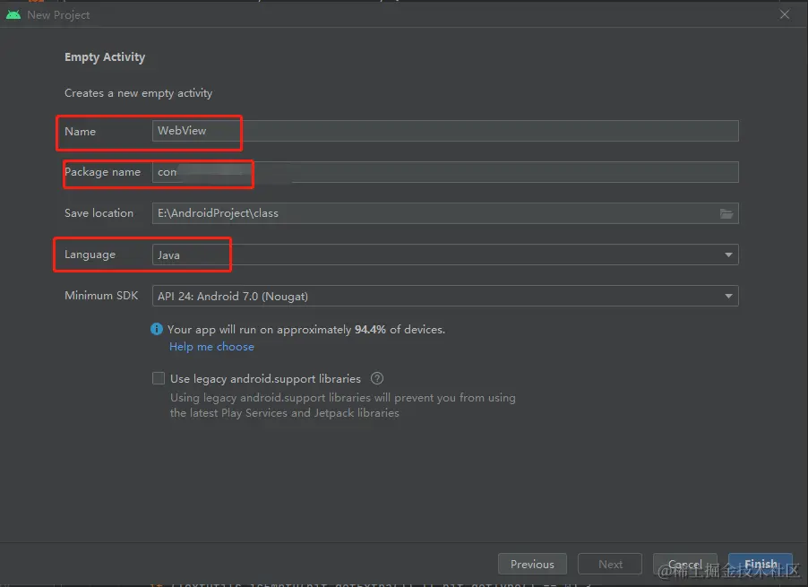 设置一下Name及Package name,注意一下Language是否选择Java。