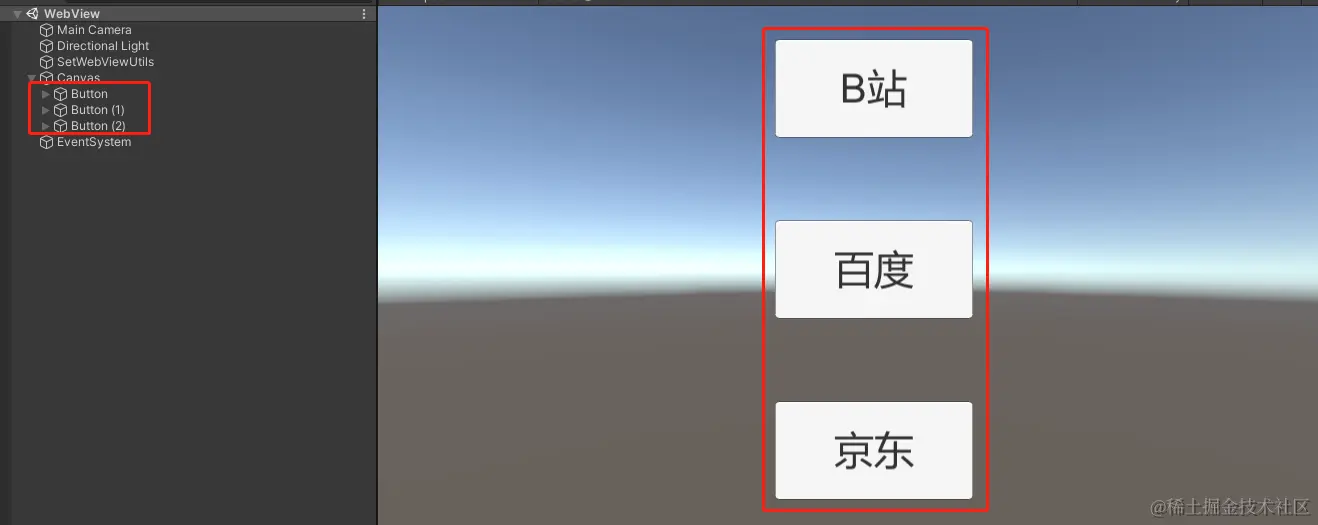 在Unity编辑器里创建三个按钮,用来打开三个不同的链接。