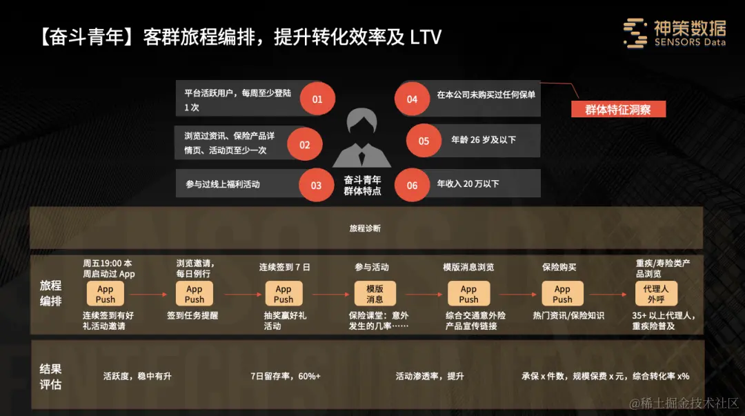 领先保险公司在针对不同客群进行数字化运营时发现,**差异化客群洞察是客户旅程编排的必要环节,**因此应针对不同客群策划个性化的营销策略,以提升转化效率和 LTV。比如,通过差异化客群洞察发现,奋斗青年群体在客户旅程中处于「产生兴趣,尝试参与线上互动」的阶段,考虑到其购买能力和购买偏好,该险企以自动化运营为主,适度进行客户行为牵引,提升客户留存与活跃度。