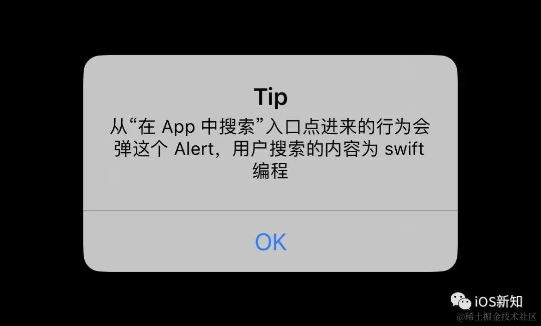 let alert = UIAlertController(title: "Tip", message: "从“在 App 中搜索”入口点进来的行为会弹这个 Alert,用户搜索的内容为 \(q)", preferredStyle: .alert)