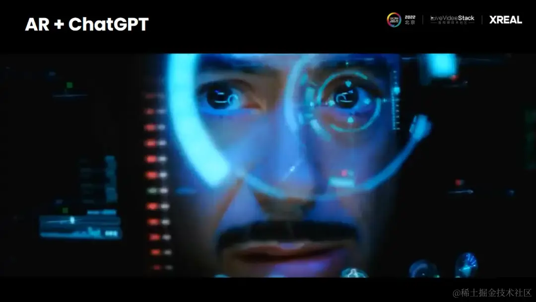 举个例子,这是大家可能都看过的电影,钢铁侠里面有一个非常有名的助手叫J.A.R.V.I.S.。每次这个钢铁侠呼唤助手时候,它就能出来。这个电影里面的技术就是一个除了硬件技术之外,非常好的展示了AR和ChatGPT个人助手的结合。