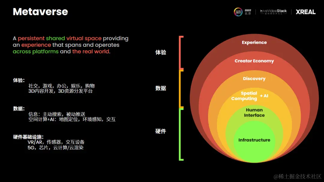我们把它定义做空间互联网。当然大家可能有更耳熟能详的名字,比如之前比较火的概念就是元宇宙。简单的给大家介绍一下,它的技术架构,是最底层的一个硬件平台,硬件平台包括整个的硬件基础设施。