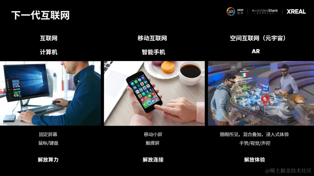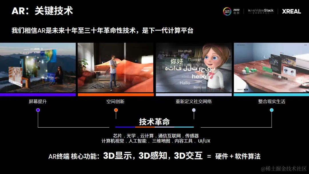 编者按:一种行业观点是,AR或是未来十年、三十年的革命性技术,是下一代计算平台。近半个世纪,我们总能听到苹果在AR行业的创新动作,开辟了新的硬件范式。AR/VR行业为苹果不断欢呼的同时,激发了人们的好奇心——究竟,人类在戴上AR眼镜的那一瞬间,感知与交互从二维平面延伸到三维空间,科幻片场景触手可及之时,和世界的交互可以是什么样子?今天LiveVideoStack大会邀请到了XREAL的联合创始人吴克艰,为我们分享XREAL在AR行业的发展演进和思考。