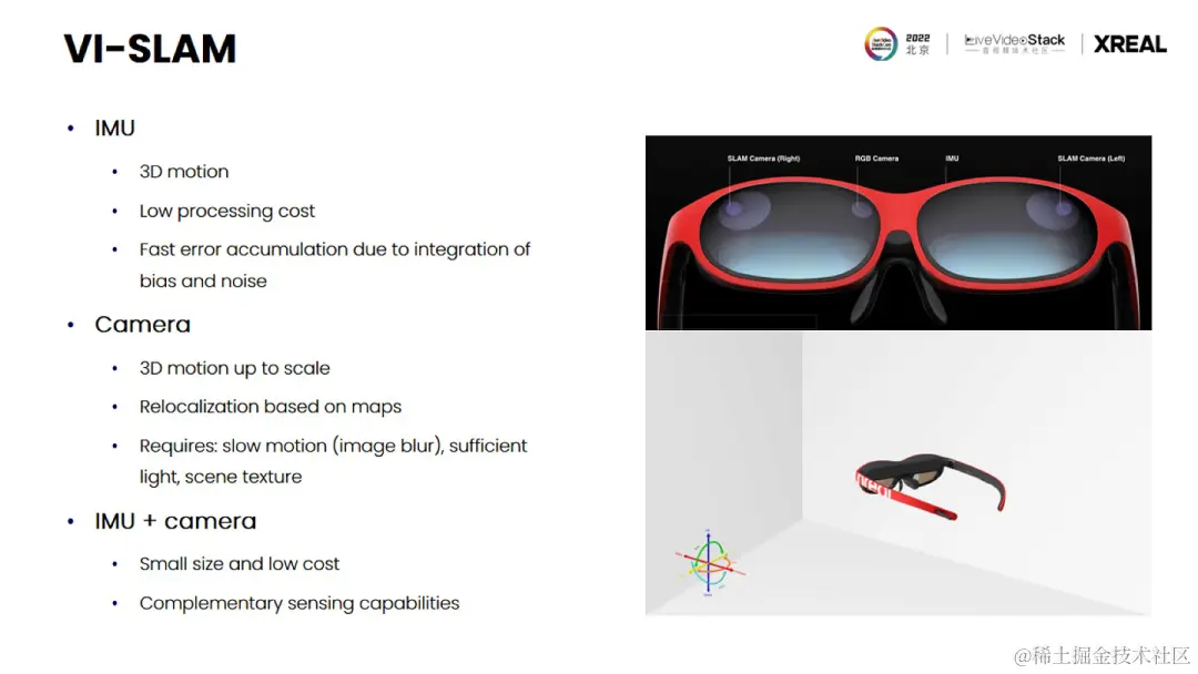 视觉惯性SLAM就是用眼镜上的摄像头和IMU对眼镜的运动作为一个追踪,当追踪到了运动以后,虚拟的物体会显示在空中。由于IMU和摄像头成本比较低,并且功耗也比较低,非常适合XR在这方面的应用。