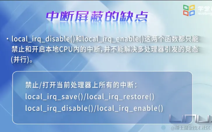 专为多处理器并发而引入的一种锁,在内核中大量应用于中断处理部分