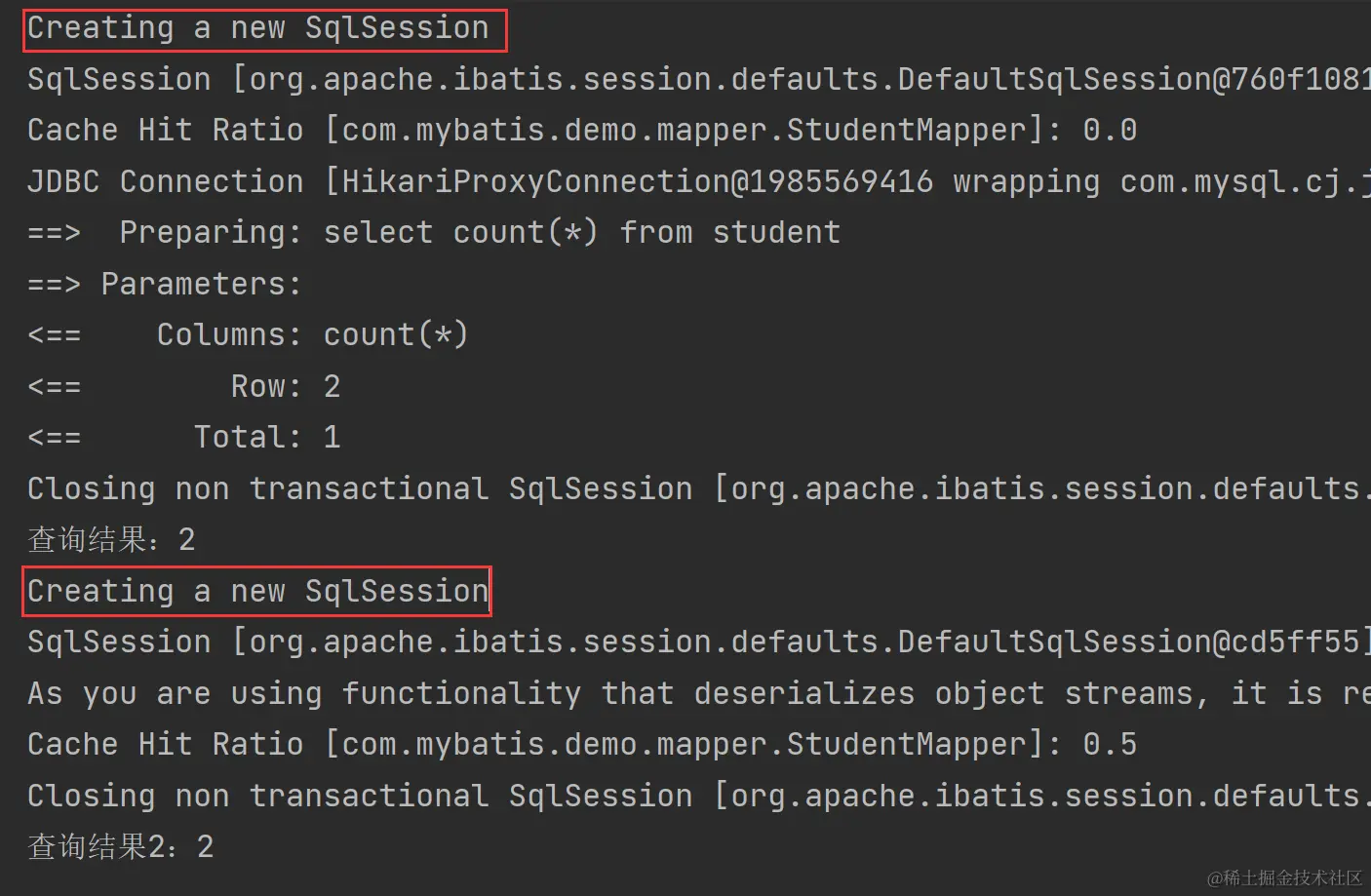 从以上结果可以看出,两次查询虽然使用了不同的 SqlSession,但第二次查询使用了缓存,并未查询数据库。