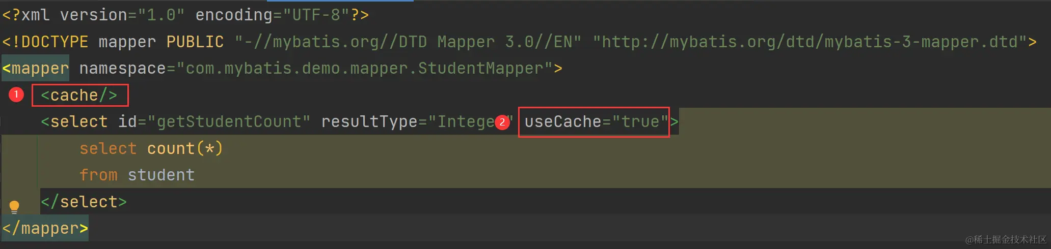 <select id="getStudentCount" resultType="Integer" useCache="true">