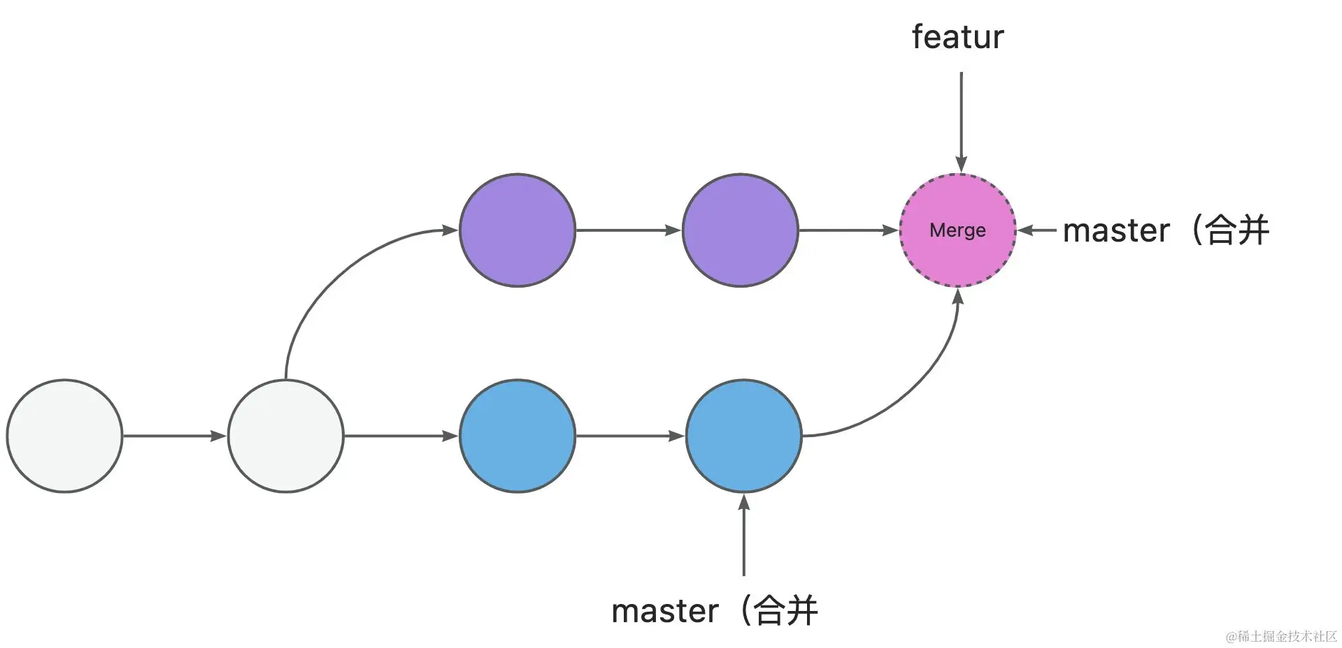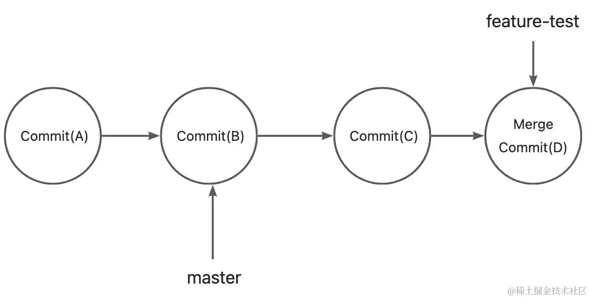 为什么呢?因为此时git不知道要做什么。merge commit是两个分支的汇合点。本质上这两个分支地位是完全相等的。例如下面的图中,master在合并后,从Commit(B)移动到了Commit(Merge), 此时的指针是与feature-test重叠的。
