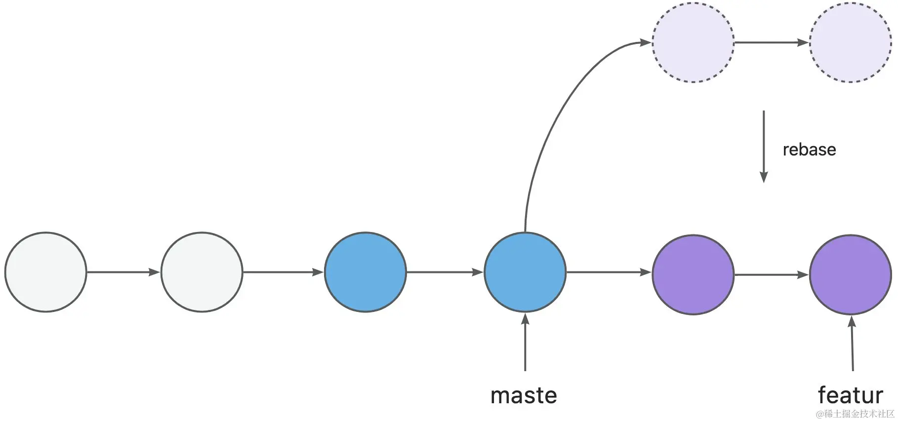 可以理解为“重新设置基线”(重新设置分支比较的起点commit),并将“新基线”以后的commit拷贝到指定的分支上。所有当前分支上在“新基线”以后的commit会被copy一份存储到一个临时区域,然后按顺序应用到指定分支上
