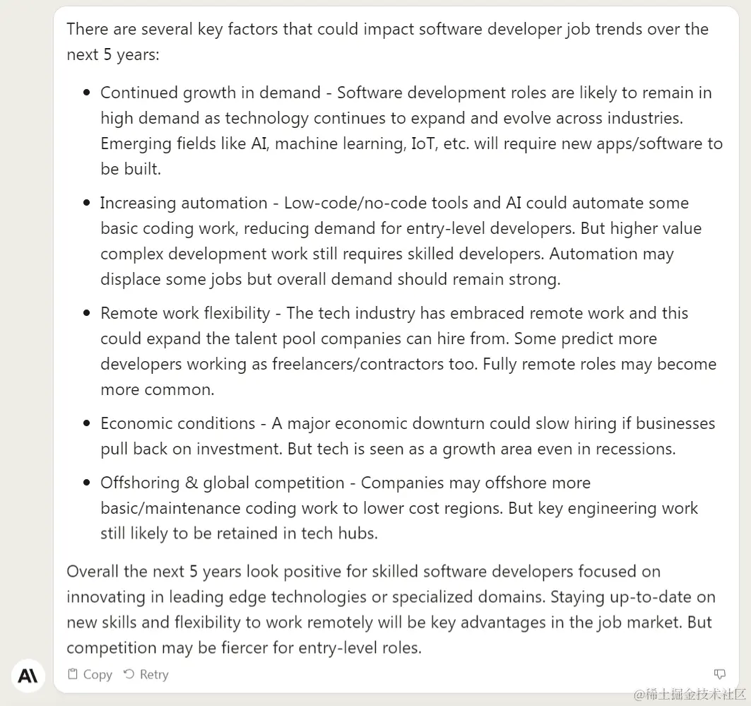 总体而言,对于专注于前沿技术或专业领域创新的熟练软件开发人员来说,未来 5 年的前景是乐观的。掌握最新技能和远程工作的灵活性将成为就业市场的关键优势。但初级职位的竞争可能会更加激烈。