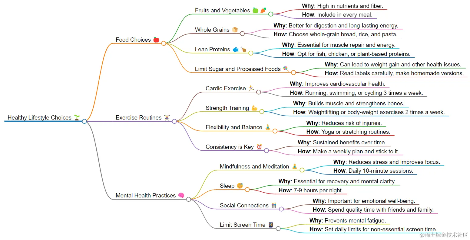 Prompt: I'm looking to make healthier lifestyle choices. Can you help me with a markdown mind map that connects food choices, exercise routines, and mental health practices? Including headers, emoji icons, and color coding. (我想选择更健康的生活方式。你能帮我绘制一张思维导图,将食物选择、运动习惯和心理健康实践联系起来吗?包括标题、表情图标和颜色编码。)