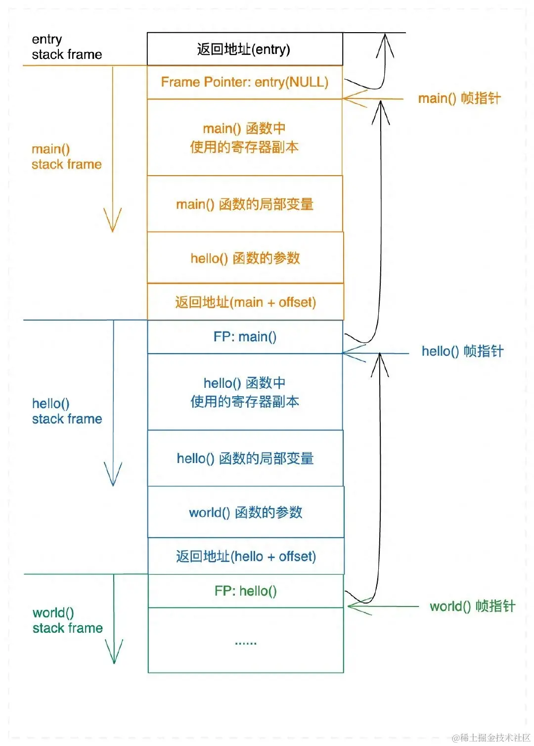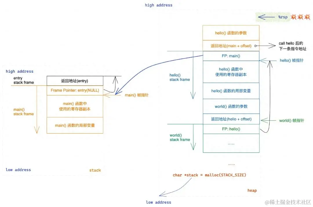 这样我们的栈帧就不是连续的了,main 的栈帧在栈上,hello 的栈帧在堆上。但其实这是没有影响的,只需要能够维护好栈帧的链式关系就可以了。在进入 hello 时,和之前一样会保存好 main 的 rbp,因此我们不需要额外关注链式结构。