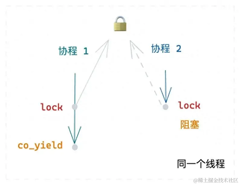 可以很好的解决这里的问题,协程 1 持有了锁,主动让出 CPU,协程 2 尝试获取锁,肯定获取不到,就会主动 yield,协程 1 继续执行,执行完后,释放锁,协程 2 就可以获取得到锁,继续执行。