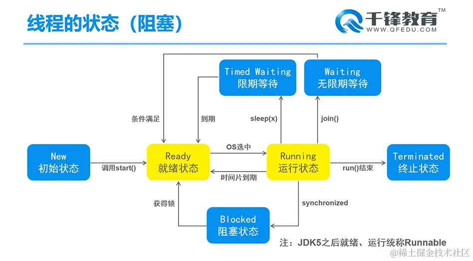 其中运行状态可以使用sleep方法进行休眠(阻塞),休眠完成后回到就绪状态