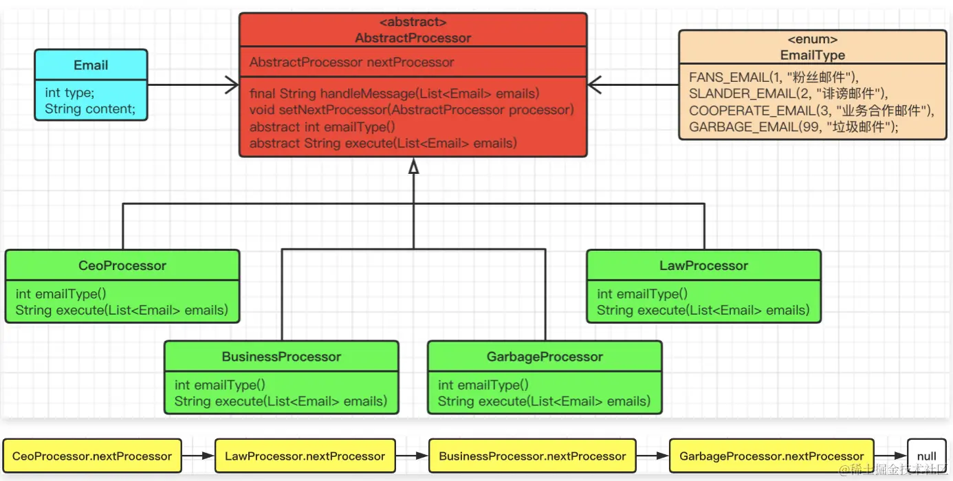 这里需要CEO先查阅邮件处理,然后再由法务部处理,随后是业务部处理,最后是垃圾邮件执行废弃。根据以上的描述,我们首先需要邮件实体类Email,和用于区分不同处理方式的邮件类型EmailType。对于所有处理者,我们首先创建一个抽象的处理器类AbstractProcessor,再创建四个处理器的实现类,分别是CEO处理器CeoProcessor、法务部门处理器LawProcessor、业务部门处理器BusinessProcessor和垃圾邮件处理器GarbageProcessor。具体类关系如下图所示: