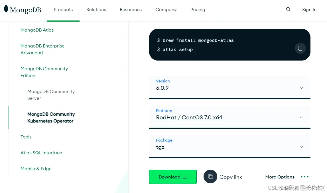 进入MongoDB的安装包下载地址,如下图,选择版本为6.0.9,环境为CentOS7.0 X64,安装包类型为tgz。