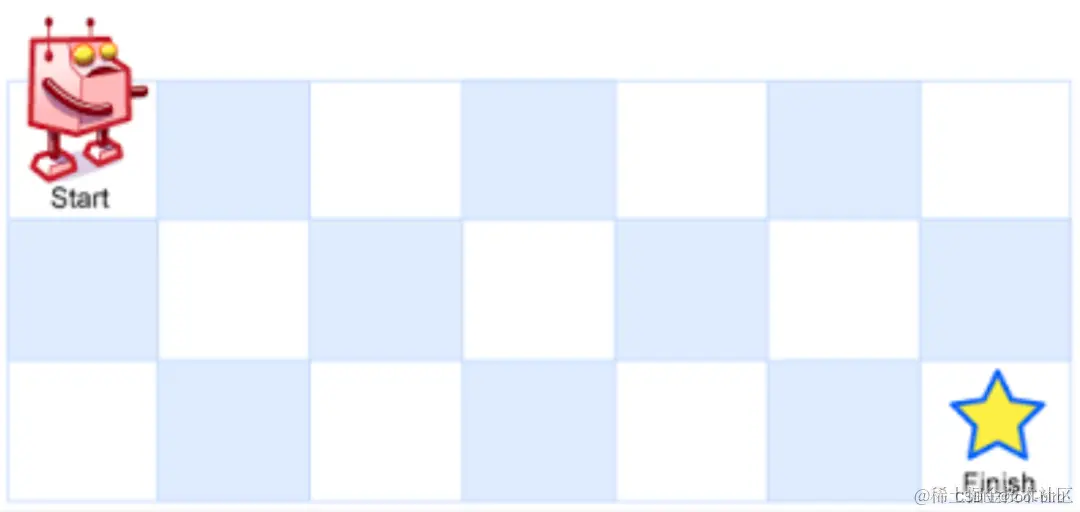 机器人每次只能向下或者向右移动一步。机器人试图达到网格的右下角(在下图中标记为 “Finish” )。