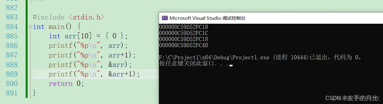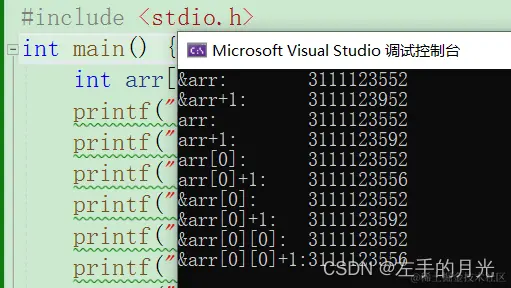 打印arr和&arr发现地址相同,你要记住地址相同但是其意思却天差地别,arr是首元素的地址,arr+1代表第二个元素的地址,步长为4个字节,也就是int类型的大小。而&arr是整个数组的地址,而&arr+1代表跨越整个数组,步长为40,也就是整个数组的大小。