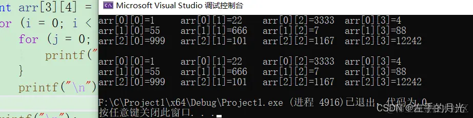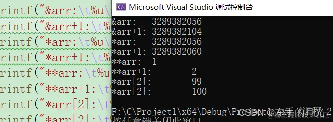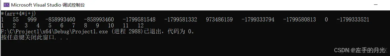 arr代表整个arr[0],为什么呢?arr=(arr+0)=a[0],懂了吧,所以步为一行的元素大小,也就是12字节,**arr代表a[0][0],因为arr=a[0]已经知道了。所以