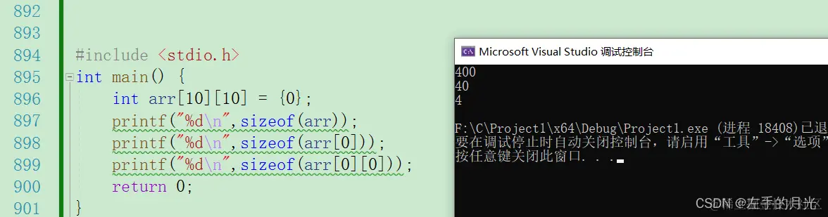 懂了没?arr是一个二维数组,arr代表整个数组大小所以是400字节,arr[0]代表第一行的大小所以是40,arr[0][0]是第一个元素的大小所以是4;我们继续看。