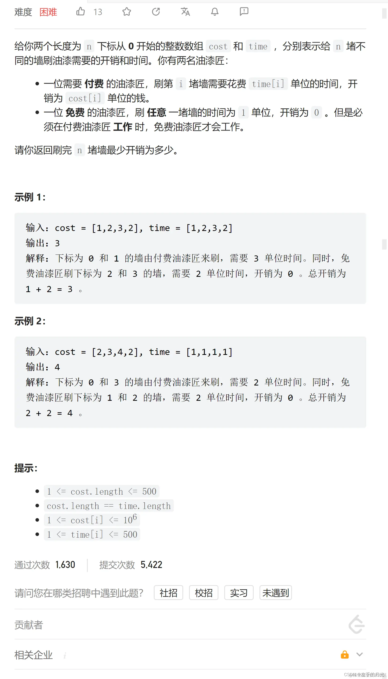 (1)付费油漆匠刷墙 i,那么免费油漆匠就会刷另外time[i]面墙,付费油漆匠刷完墙 i 花费为cost[i],付费和免费两位油漆匠一共刷了time[i]+1面墙。