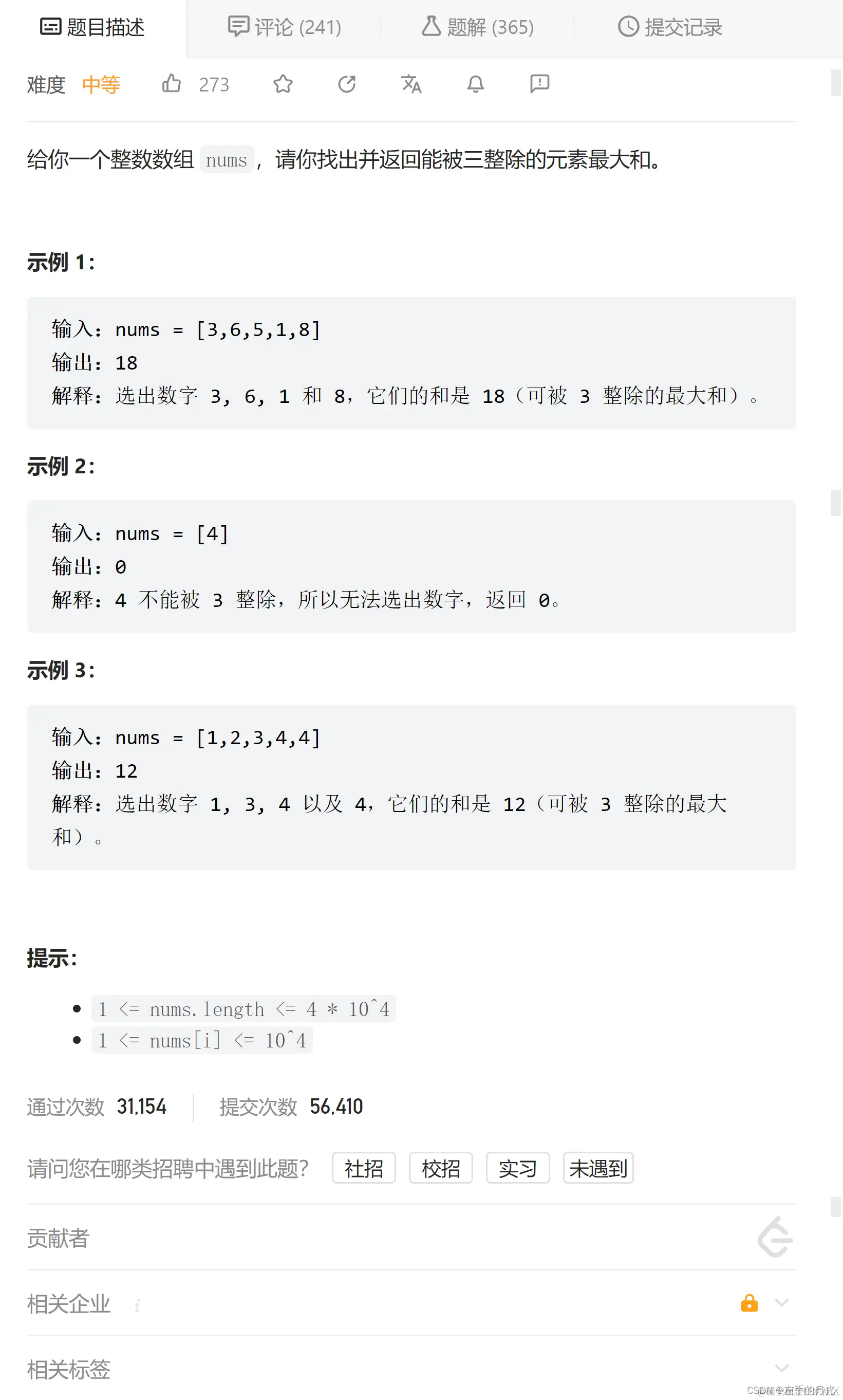 由于数组中没有负数,如果整个数组的元素和 s 可以被 3 整除,那么 s 就是最大的元素和。