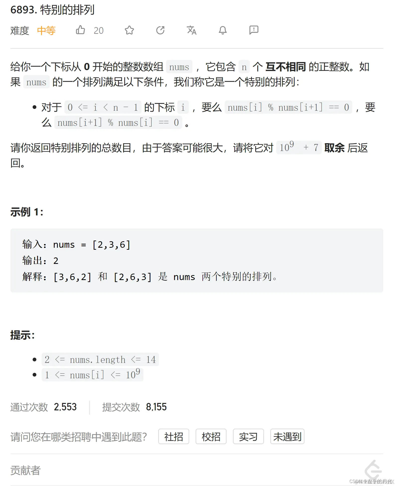 首先定义 dfs(i,j) 表示当前可以选的下标集合为 i,上一个选的数的下标是 j 时,可以构造出多少个特别排列。