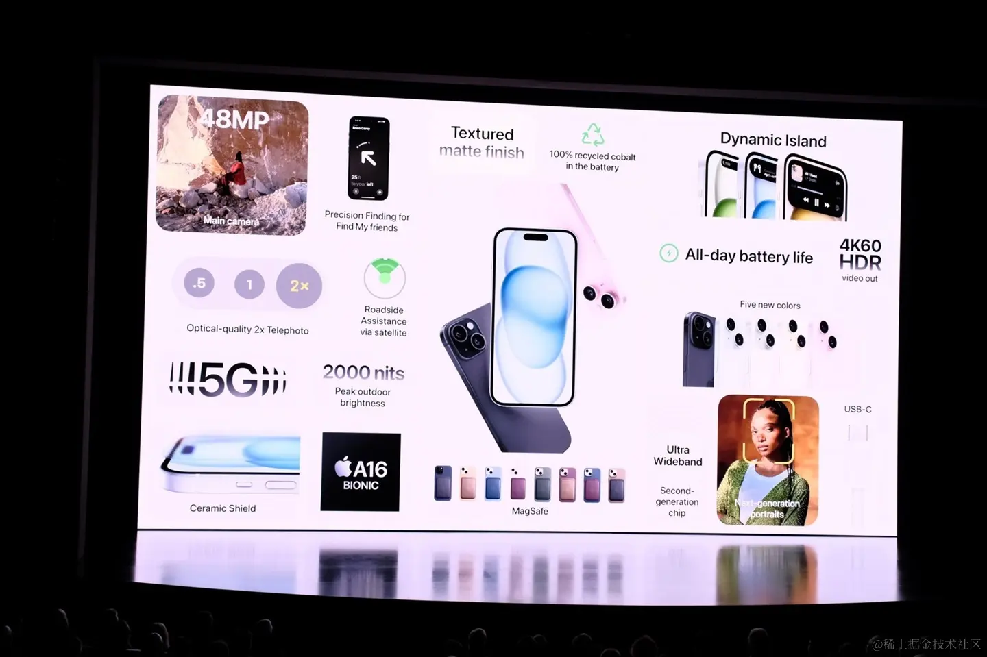 苹果表示 iPhone 15 标准版户外峰值亮度为 2000 尼特,是 iPhone 14 的两倍,支持 1600 尼特的 Dolby Vision。
