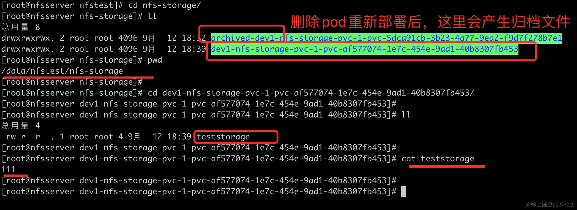 可以看到如我们预料的那样,通过storageClass自动创建了PV,同时在NFS对应的存储目录上创建了文件,写入了数据。