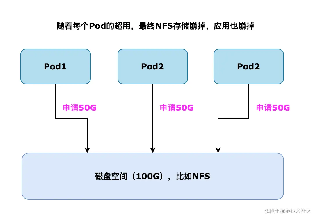 在没有使用PV、PVC之前,各个Pod都可以任意的向存储资源里(比如NFS)写数据,随便一个Pod都可以往磁盘上插一杠子,长期下去磁盘的管理会越来越混乱,然后导致数据使用超限,磁盘爆掉,最后导致磁盘上的所有应用全部挂掉。