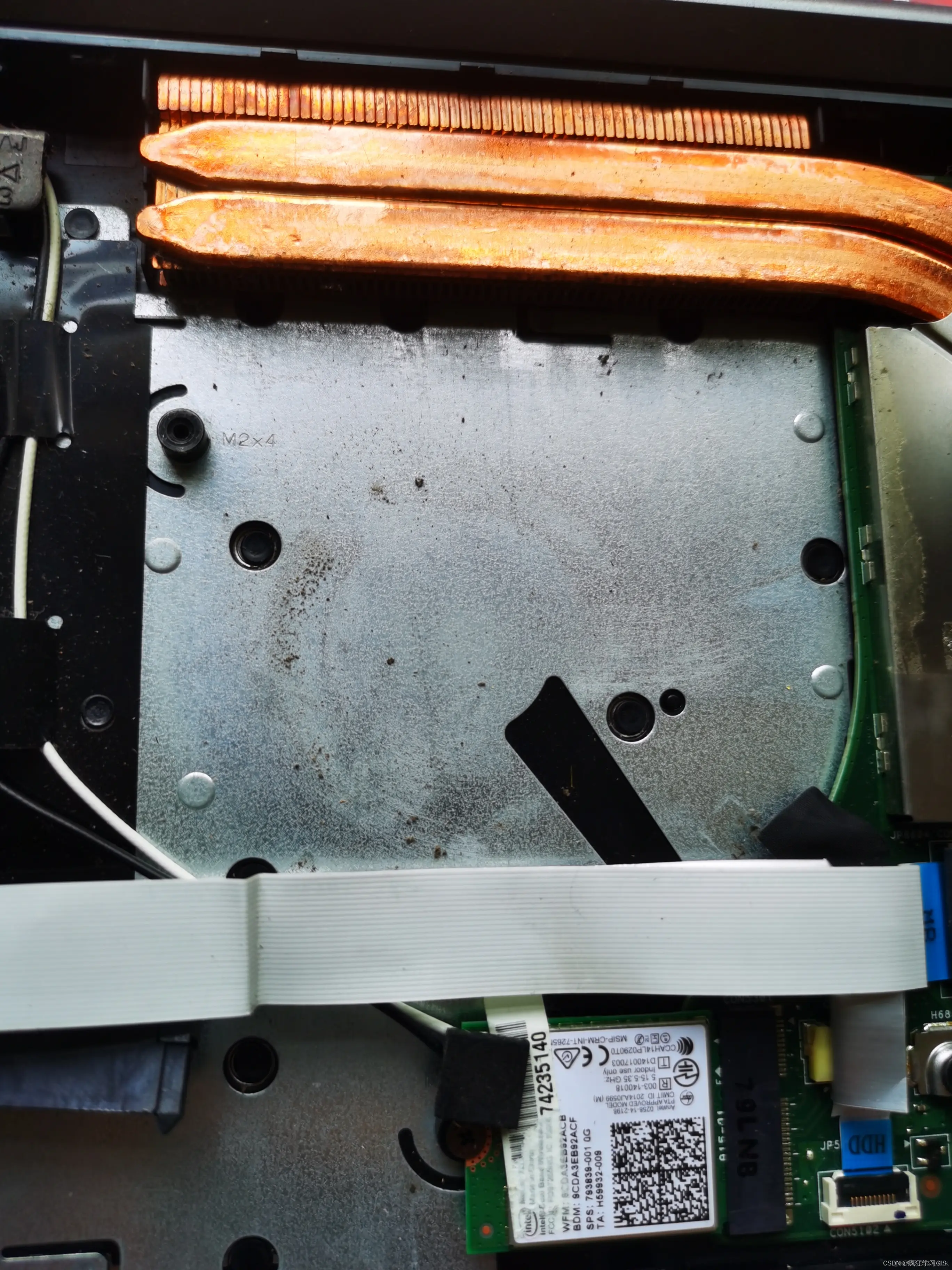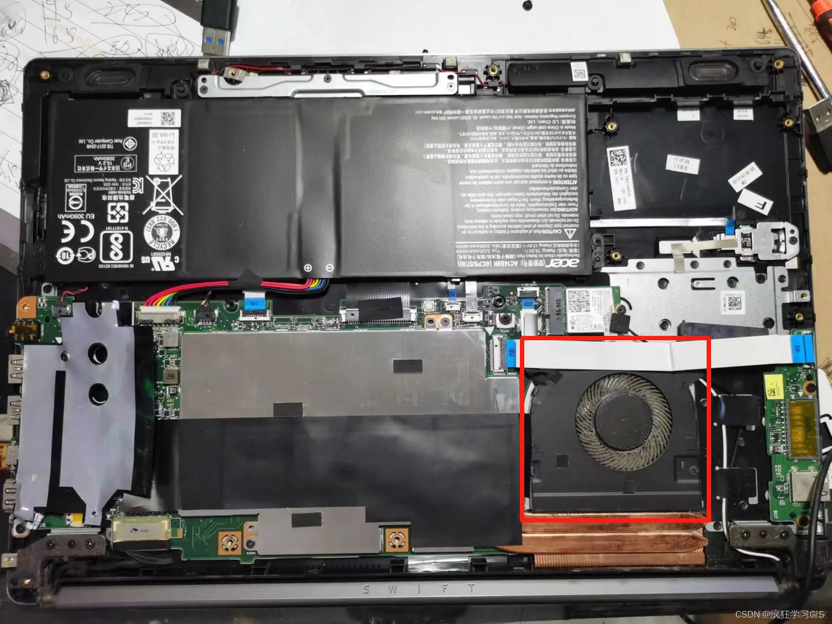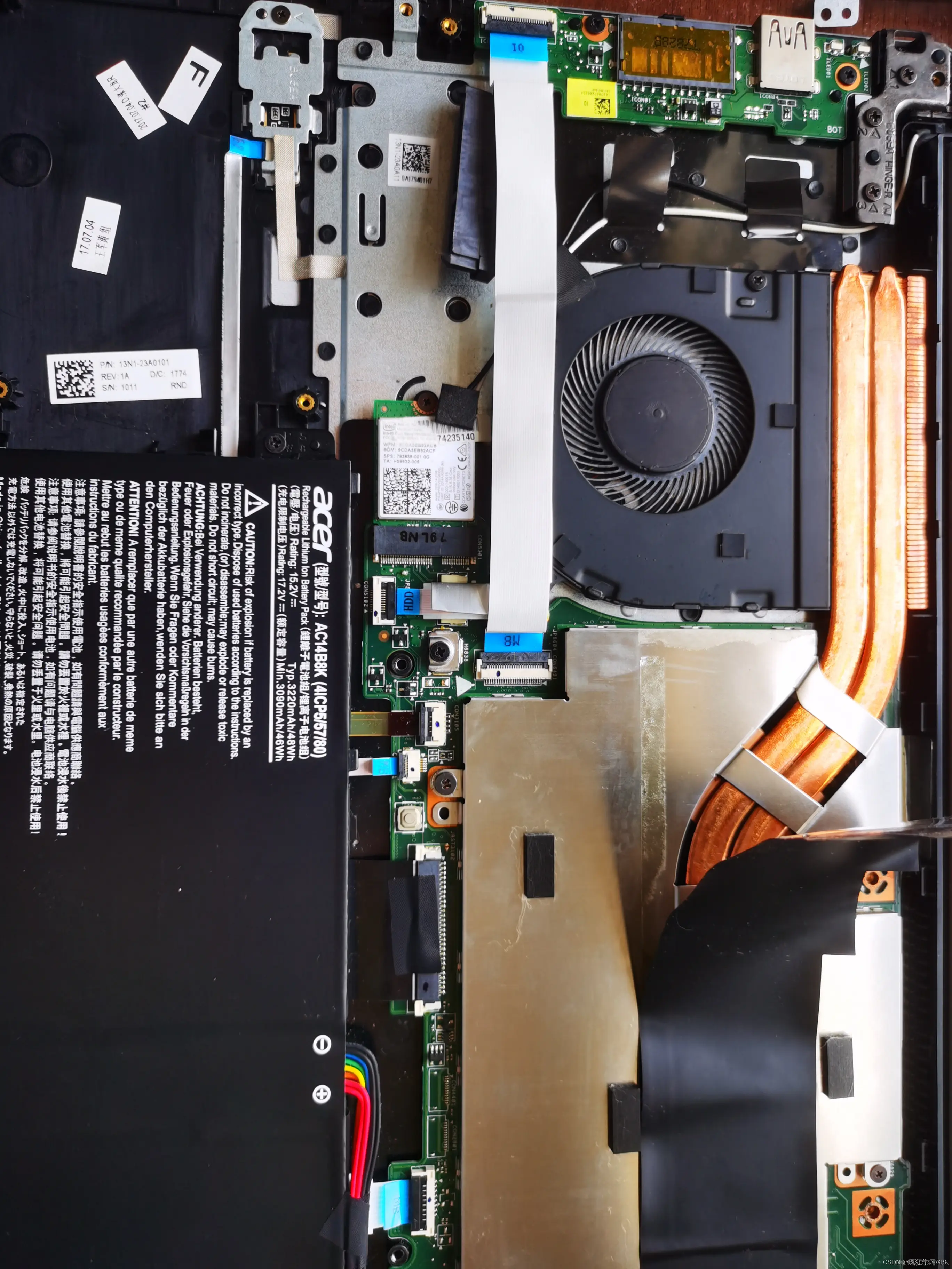 话不多说,我们开始拆机与清灰的操作方法介绍。其中,关于笔记本电脑的拆机方法,大家参考我们之前的文章# 如何自行为笔记本电脑更换固态硬盘?即可,我们这里直接从拆机后的操作开始介绍。这里需要注意,拆机后一定首先要将电脑电池的排线拔掉,再进行后续操作。