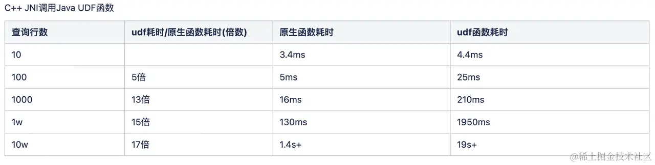 当然这些问题和一开始的设计息息相关:开发 UDF 之初,其实是想兼容 C++ 的 so 包和 Java 的 jar 包,但测试了 C++ Jni 调用 Java 的性能,发现基本上无法用于大规模的生产。