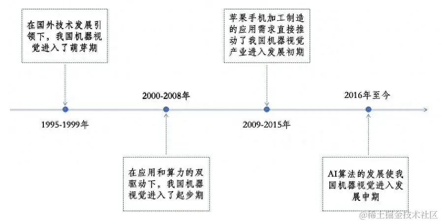1995-1999年,我国机器视觉行业依靠引进和吸收国外的设备和技术进入萌芽期;
